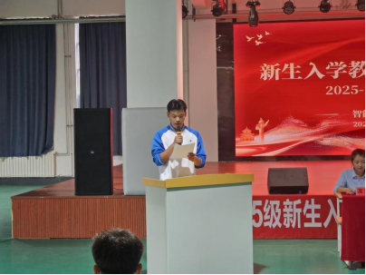 新生代表2025级王俊同学发言,表达了加入智能制造学院的荣幸与激动,并代表全体新生承诺将勤奋学习、不负韶华。