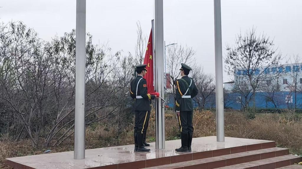 在主持人25机械制造5班张家麒同学庄重宣布仪式开始后,国旗护卫队迈着铿锵有力的步伐护送国旗入场。全体师生面向国旗肃立,高唱国歌,注视五星红旗冉冉升起,迎风飘扬在晨曦之中。